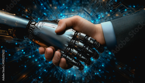 Robotic and human handshake representing AI-human cooperation in a futuristic digital world