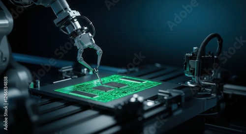 Robotic arm assembling a microchip on a circuit board in a high-tech environment