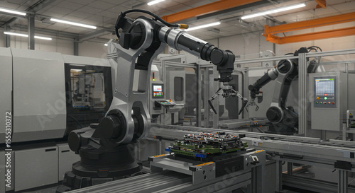Robotic arm assembling circuit board on conveyor belt in automated factory environment with machines