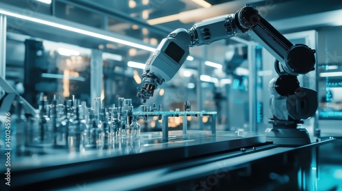 Robotic arm assembling electronic components in a modern laboratory setting with advanced technology