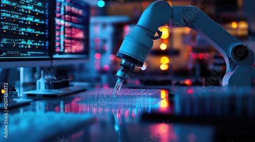Robotic arm performing lab tests; screens display data; night lab