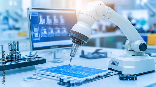 Robotic Arm Performing Precision Task on Circuit Board in High-Tech Lab