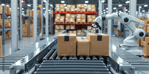 Robotic arm sorting packages in automated warehouse facility with conveyor belt, efficiency, robotic arm