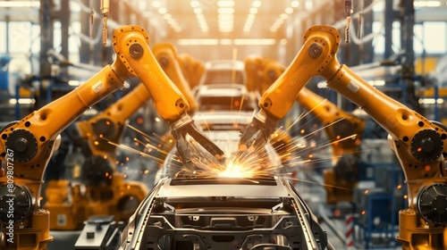 Robotic arm welding car in factory Automotive design in action