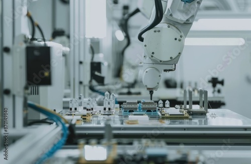Robotic arm working on an assembly line in a high-tech manufacturing facility
