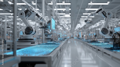Robotic arms are engaged in assembly tasks on a production line in a modern factory.
