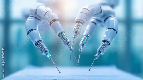 Robotic arms equipped with syringes poised over a surface, symbolizing advanced technology in healthcare and precise medical procedures.