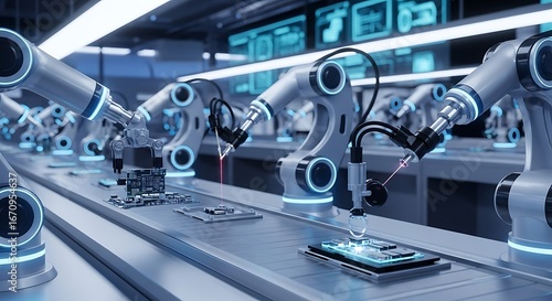 Robotic arms in a high-tech manufacturing process utilizing laser technology for precision assembly