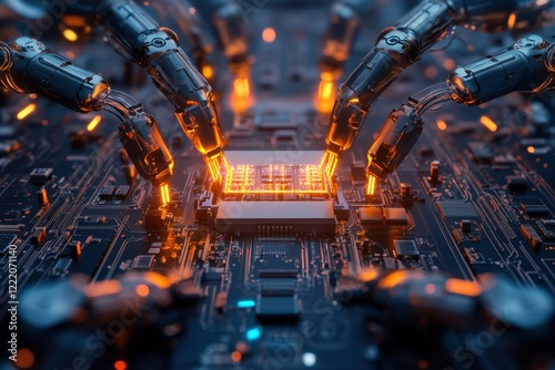 Robotic arms install a glowing CPU onto a circuit board. Illustrates automation in tech manufacturing, ideal for AI, robotics, and technology concepts.