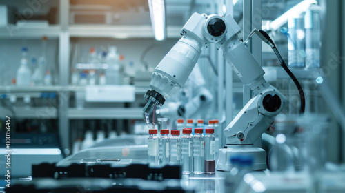 Robotic arms performing precise measurements and mixing substances, showcasing how automation enhances efficiency and accuracy in drug development