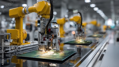 Robotic arms work on circuit boards in a modern factory. Shows automation, engineering, & the future of manufacturing.
