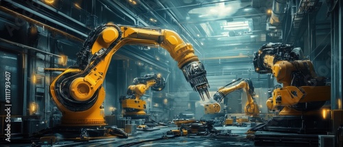 Robotic arms working in a high-tech manufacturing facility during evening hours
