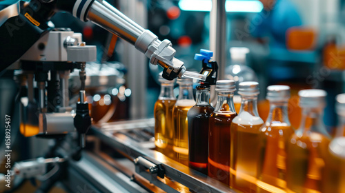 Robotic hands applying labels on bottles in a beverage manufacturing plant