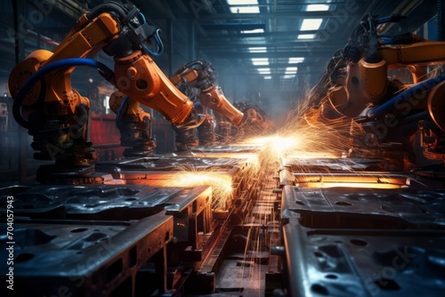 robotic welding assembly line, plasma cutting, abstract fictional robots. sparks from welding work