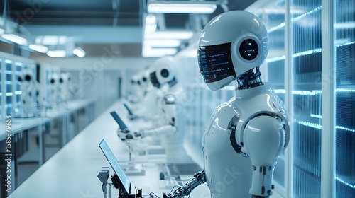 Robotics Assembly Line: A futuristic scene captures advanced robots engaged in their tasks within a state-of-the-art laboratory, creating an aura of technological progress and innovation.
