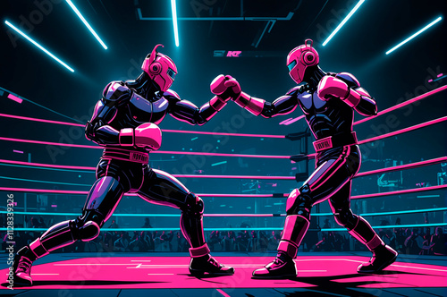 Robots boxing in the ring, illustration, neon aesthetics, neo-noir, cyberpunk. Generative AI.