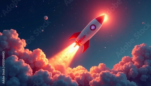 Rocket flying high with bright lightbulb on top, bright lightbulb, ascension