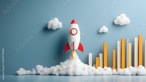 Rocket Launch Business Concept Ascending to Success and Growth Symbolic Representation with Charts and Clouds Inspiring Innovation and Progress