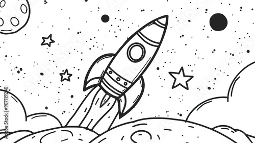 Rocket Launching Into Outer Space Surrounded by Stars and Planets in Black and White Line Art