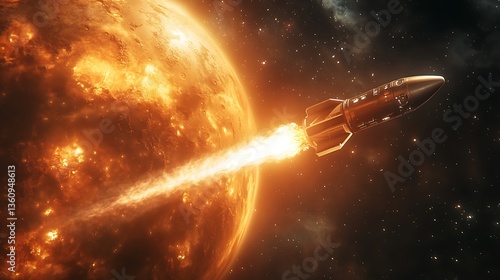 Rocket Launching into Space from Planet Surface, A rocket launching into space from a planet's surface, surrounded by clouds and stars