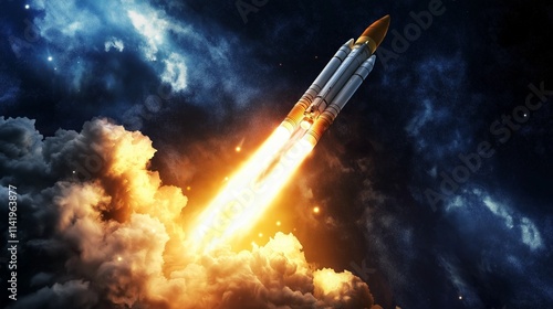 rocket launching into space, leaving behind a trail of light, representing groundbreaking achievements and limitless success