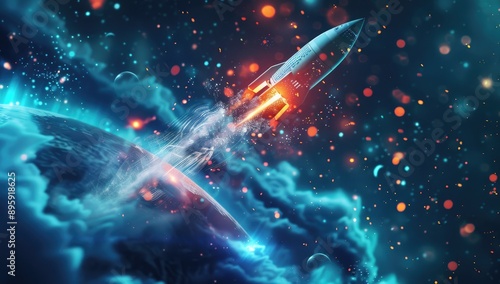 Rocket Launching into Space with Vibrant Nebula Background and Bokeh Effect