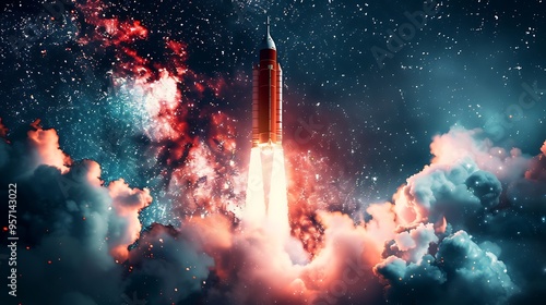 Rockets blasting off into the unknown, seen from a worm's-eye perspective, evoking the wonder and excitement of space exploration