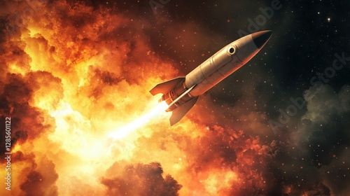 Rocket's Fiery Ascent: A rocket soars into the night sky, leaving behind a trail of vibrant flames and smoke in an awe-inspiring display of power and technological advancement.