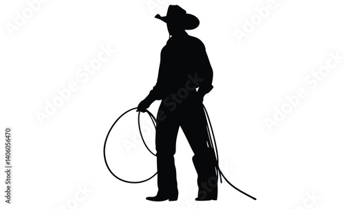 Rodeo cowboy riding horse silhouette, Western lasso action graphic, Horseback rider with rope illustration