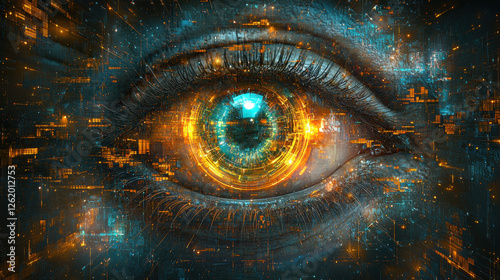 Rogue hacker with AI vision analyzing security systems for a digital breach in a high-tech, futuristic environment