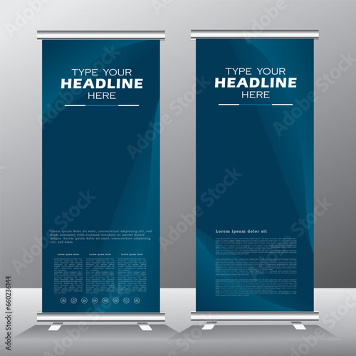 Roll up banner design with blue background, vertical banner template, abstract geometric shape, green pull up banner, vector eps 10