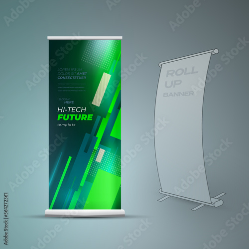 Roll up banner hi-tech future lines action theme green color vector