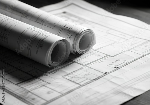 Rolled architectural drawings on an unfolded floor plan with black-and-white lines and construction details.