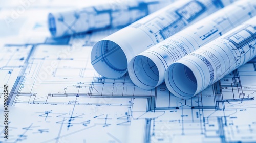 Rolled blueprints on a table, showing detailed architectural plans.