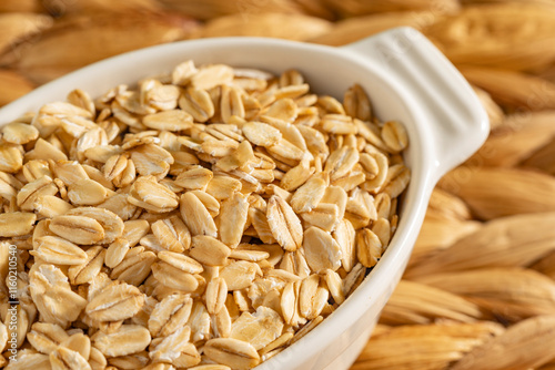 Rolled oats in a white ceramic bowl on a woven rustic surface. Ideal for breakfast, healthy snacks, or natural recipes.