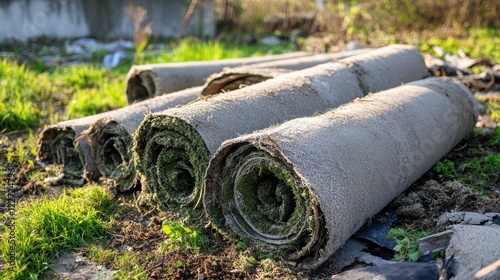 Rolled Up Carpet Placed on Ground Surrounded by Grass and Debris