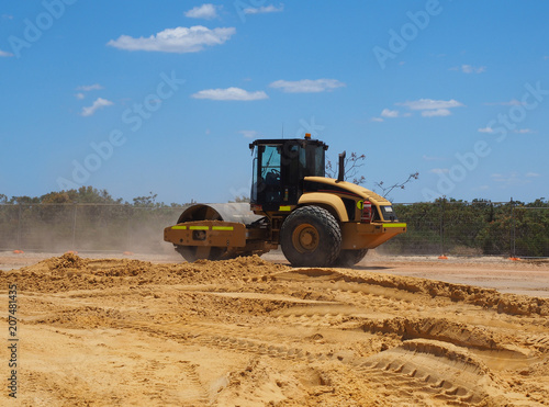Roller compactor working on construction site