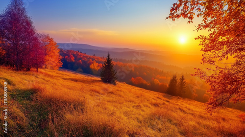 Rolling autumn hills at sunset with golden and red foliage