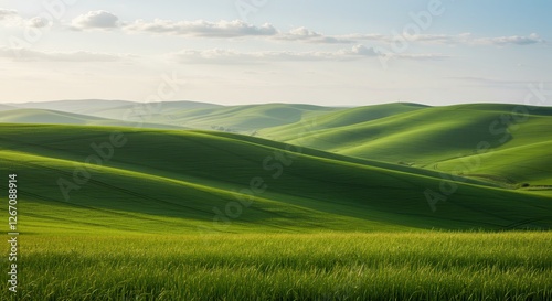 Rolling Green Hills Landscape with Field in Foreground and Blue Sky