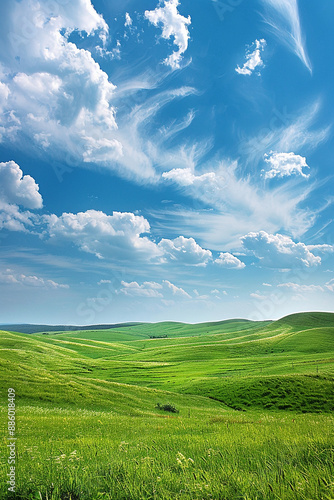 Rolling green hills under a sky filled with wispy clouds, capturing the beauty of nature and the concept of serenity.