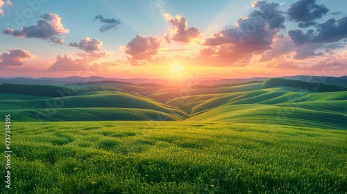Rolling green hills with a colorful sunset in the background. AI generative. .
