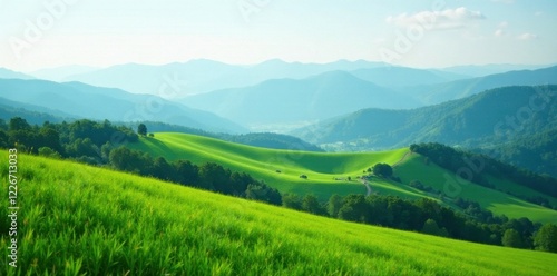 Rolling hills of lush greenery with misty mountains in the distance, calm, hills