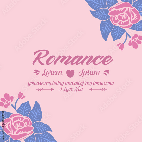Romance greeting card template design, with elegant leaf and pink rose flower frame design. Vector