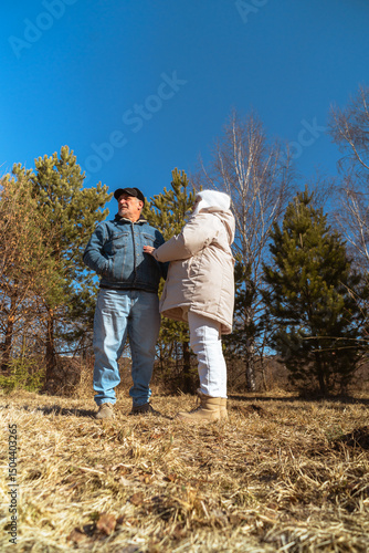 Romantic and elderly healthy lifestyle concept. Senior active Caucasian couple holding hands looks happy in park in autumn forest,happy anniversary,happily retired married couple together