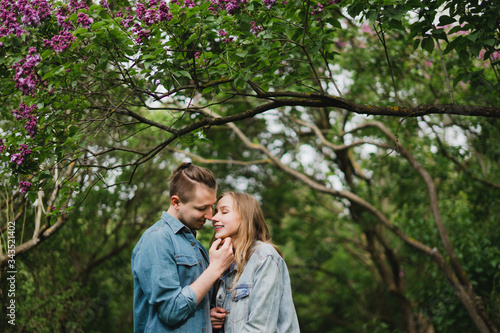 Romantic and happy caucasian couple in casual clothes hugging on the background of beautiful blooming lilac. Love, relationships, romance, happiness concept. Man and woman walking outdoors together.