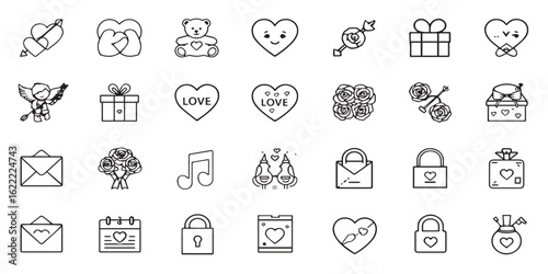 Romantic and Valentine line icon set. Vector pictograms of hearts, gifts, and love symbol, teddy bear, cupid, flower bouquet, engagement ring, chocolate candy, thin linear illustration