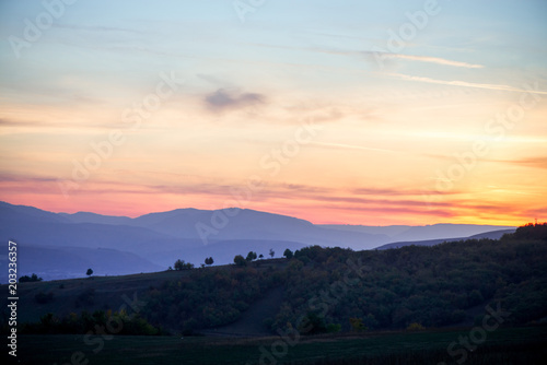 Romantic, bright and colorful sunset over a mountain range in Transilvania. Beautiful, colorful autumn background