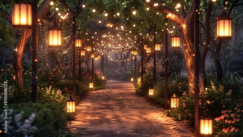 Romantic Enchanted Garden Pathway with Lanterns and Fairy Lights at Dusk