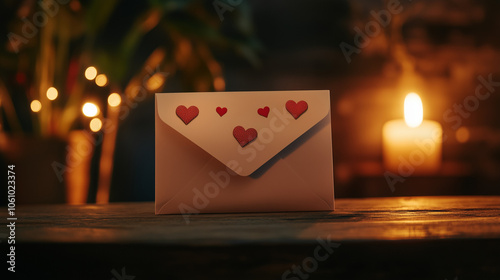 Romantic envelope with heart decorations in candlelit setting with bokeh effects