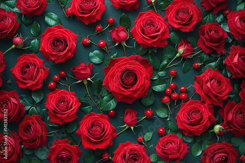 Romantic Flat Lay Bird's Eye View of Elegant Red Rose Floral Pattern